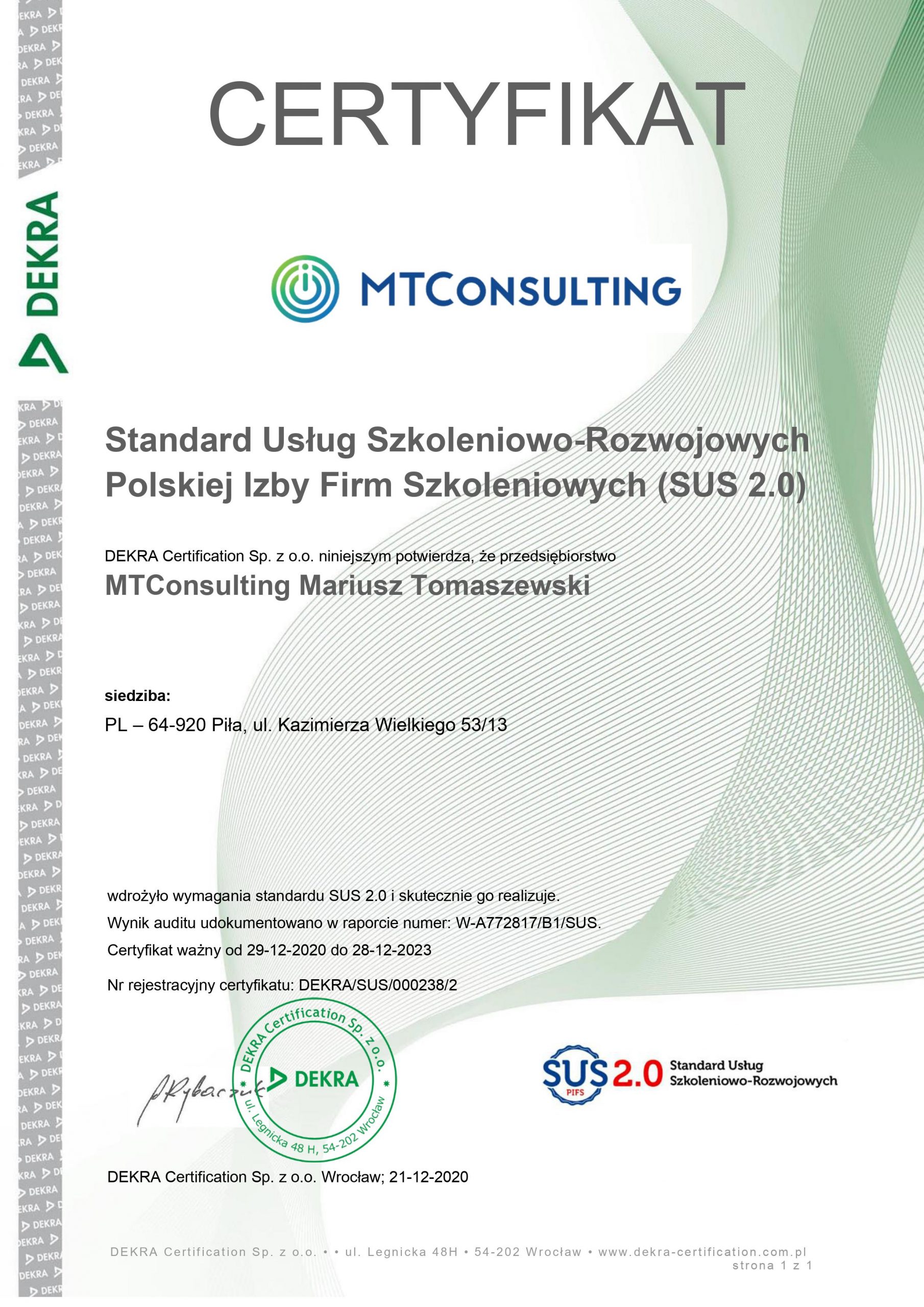 Szkolenia z EFS może zrealizować dla Ciebie firma szkoleniowa, która znajduje się w Bazie Usług Rozwojowych i posiada odpowiedni certyfikat jakości. Nie wszystkie firmy widniejące w BUR, posiadają tego typu wyróżnienie. Nasza firma spełnia szereg kryteriów, które potwierdza uzyskany przez nas certyfikat SUS 2.0, czyli Standard Usług Szkoleniowo-Rozwojowych. Potwierdza on najwyższy standard realizowanych przez nas działań w obszarze szkoleniowym, zgodnych z normami Polskiej Izby Firm Szkoleniowych. Certyfikat ten pozwala oferować naszym klientom szkolenia dofinansowane z Europejskiego Funduszu Społecznego oraz potwierdza wysoki profesjonalizm oferowanych usług.